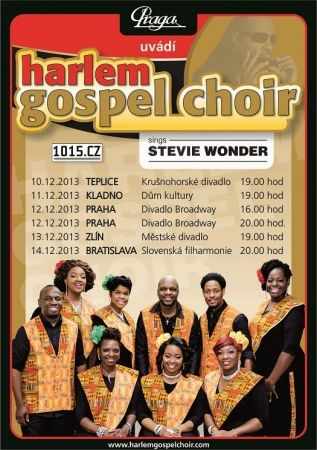 Originální gospelový soubor HARLEM GOSPEL CHOIR se po třech letech vrací do České a Slovenské republiky. Tentokrát s programem HARLEM GOSPEL CHOIR SINGS STEVIE WONDER. Nejslavnější a nejúspěšnější gospelový sbor světa – Harlem Gospel Choir – dorazí v prosinci po tříleté pauze do České republiky. Kromě standardních zastávek z předchozích let se letos nově představí na dvou exkluzivních koncertech v pražském divadle Broadway a turné zakončí v Bratislavě. Turné Harlem Gospel Choir se vrací do České republiky již pošesté – všechna předchozí vystoupení byla beznadějně vyprodaná. Tentokrát potěší české publikum celkem 6x! Turné pod názvem "Harlem Gospel Choir Sings Stevie Wonder" slibuje gospely, vánoční tradicionály a premiérově také hity Stevie Wondera! Harlem Gospel Choir šíří lásku a radost po celém světě. Jedněmi z největších fanoušků jsou bezesporu ti čeští. Samotní členové sboru se k nám vždy velmi těší a je pro ně, podle jejich slov, velkou poctou moci vystoupit před publikem, které je tak miluje a fandí jim, a se kterým je každý koncert opravdovou společnou radostí. Letos v prosinci navštíví Harlem Gospel Choir, mimo jiné, také Polsko, Itálii, Portugalsko, Finsko, Norsko, Polsko, Maďarsko. Jejich koncertní kalendář je plný do konce roku 2014, proto jsme velmi rádi, že je opět letos přivítáme u nás v České republice.