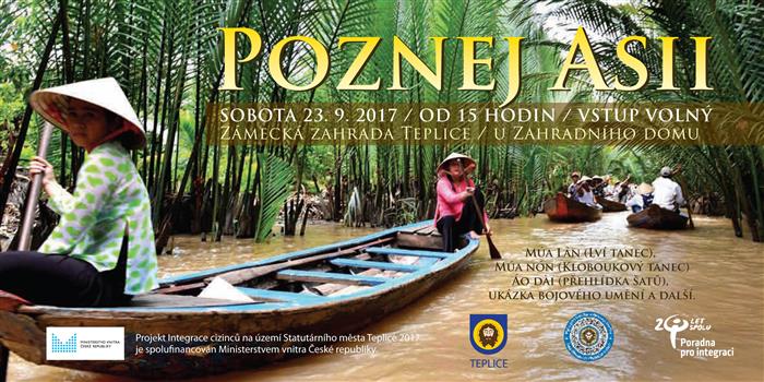 V rámci projektu Integrace cizinců na území statutárního města Teplice, který je spolufinancován Ministerstvem vnitra České republiky, proběhne v sobotu 23.9.2017 od 15:00 hod. třetí ročník etnické akce POZNEJ ASII. Oblíbená akce, kterou loni navštívilo více než 1 000 návštěvníků, se uskuteční v Zámecké zahradě v Teplicích, u Zahradního domu. Součástí bohatého programu budou folklorní vystoupení, přehlídka šatů, ukázky bojových umění, regionální asijské kuchyně a další.