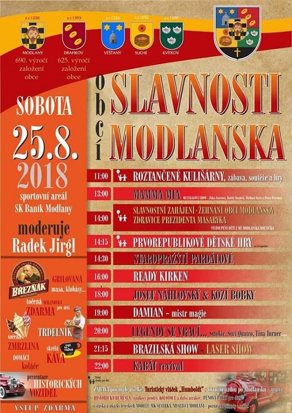 V sobotu 25. srpna 2018 se ve sportovním areálu SK Baník Modlany konají Slavnosti obcí Modlanska. Bohatý program, který odstartuje v 11:00 hod., nabízí soutěže a hry pro děti, ale také laser show a jiné. Celou akci moderuje Radek Jirgl. Můžete se těšit na vystoupení kapel Ready Kirken a Kabát revival, ale také na historická řemesla, výstavu a ukázky leteckých modelů MK Severka, kolotoče, turistický vláček "Humboldt" i stánkový prodej.