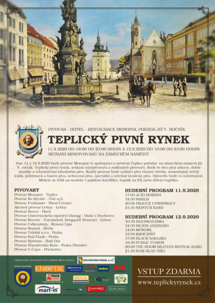 Pivovar Monopol pořádá ve spolupráci s městem Teplice již V. ročník oblíbené akce Teplický pivní rynek. Opět nás čeká den plný zábavy, dobré muziky a hlavně ochutnávání těch nejlahodnějších moků známých i méně známých minipivovarů a rodinných pivovarů. Každý z nich bude nabízet piva vlastní výroby a opravdu bude co ochutnávat. Můžete se těšit na soutěže v pojídání knedlíků, tuplák na EX nebo držení tupláku. K hudbě a tanci zahraje spousta kapel a hostem večera bude Ivan Hlas Trio.